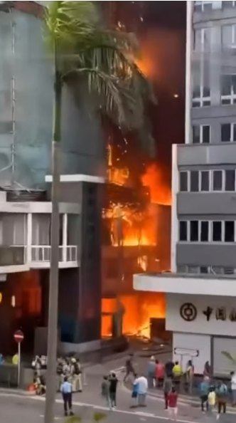 4:24 p.m. at the Chinachem Tower on Connaught Road Central. Within minutes, flames spread rapidly across the bamboo scaffolding that covered the exterior of the skyscraper. Witnesses described seeing bright orange flames racing up the side of the building, while debris fell onto the street below.