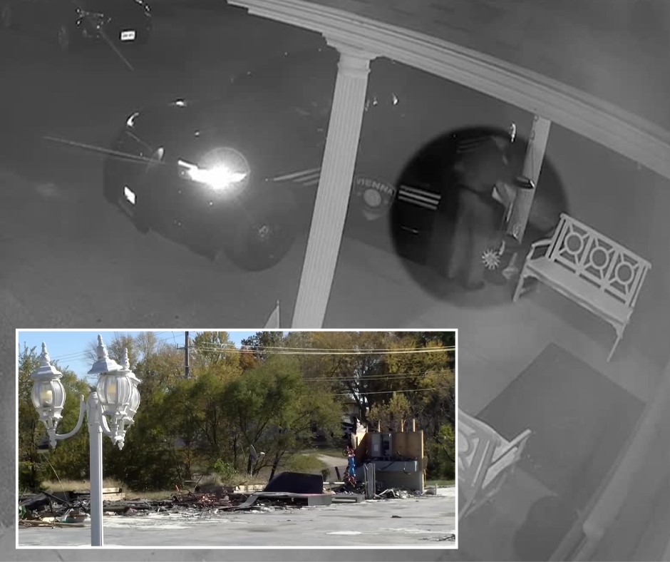 About 90 minutes later, video shows a small glow develop in the planter, which transitions into open flames that spread to the building’s entrance.