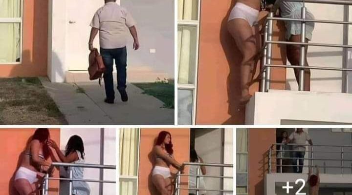 The incident occurred in what appears to be a residential complex. In the photographs, a man wearing a beige shirt and carrying a briefcase can be seen walking toward the apartment door. Meanwhile, from the second-floor balcony, two women—one in underwear and the other in pajamas—watch the man’s arrival with obvious concern.