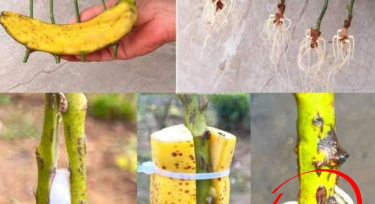 Take a ripe, organic banana, slice it open lengthwise, and gently wrap the fleshy center around the area of the rose stem where you made the cuts. Secure it in place with a clip—firm but not too tight. The banana acts as a natural rooting hormone and fertilizer!