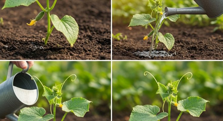 - Pollination Assistance – If cucumber flowers are not producing fruit, gently hand-pollinate them by transferring pollen from male to female flowers using a small brush.