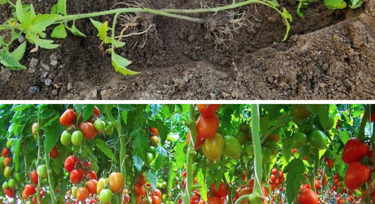 Plant the tomatoes deep into the soil, burying them up to the third leaf node. This method encourages the growth of additional roots along the buried stem, enhancing nutrient absorption and overall plant stability. Learn more about the benefits of planting tomatoes on their side.