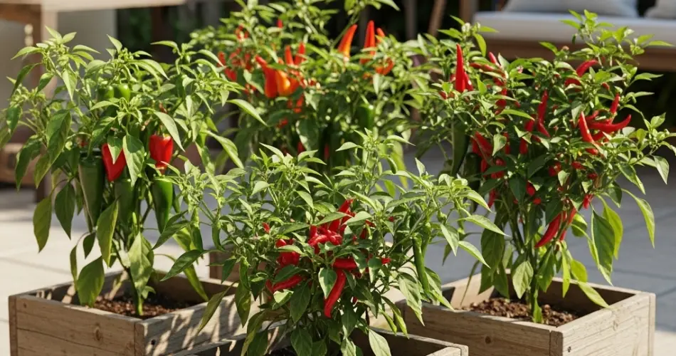Depth and size: Chili peppers develop strong root systems. Select a wooden box that is at least 12–16 inches deep and 14–18 inches wide. Each plant will need adequate space, so don’t overcrowd them.
